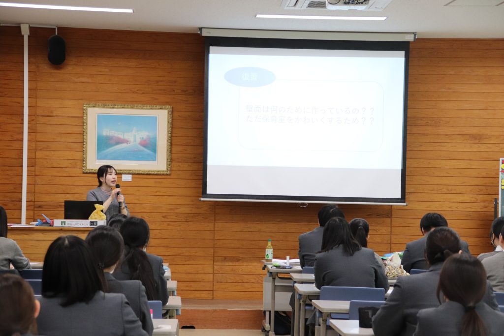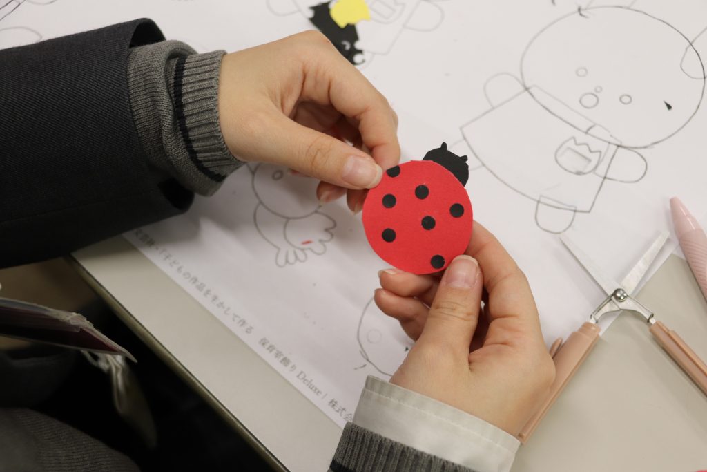 授業では、季節感や子どもの発達段階を意識したデザインの考え方、それがどのように子どもたちの成長過程に影響するかや安全面に配慮した素材選びなど、保育現場を想定した実践的な視点からご指導いただきました。実際に大学の講義で使われる教材を使用し進められました。