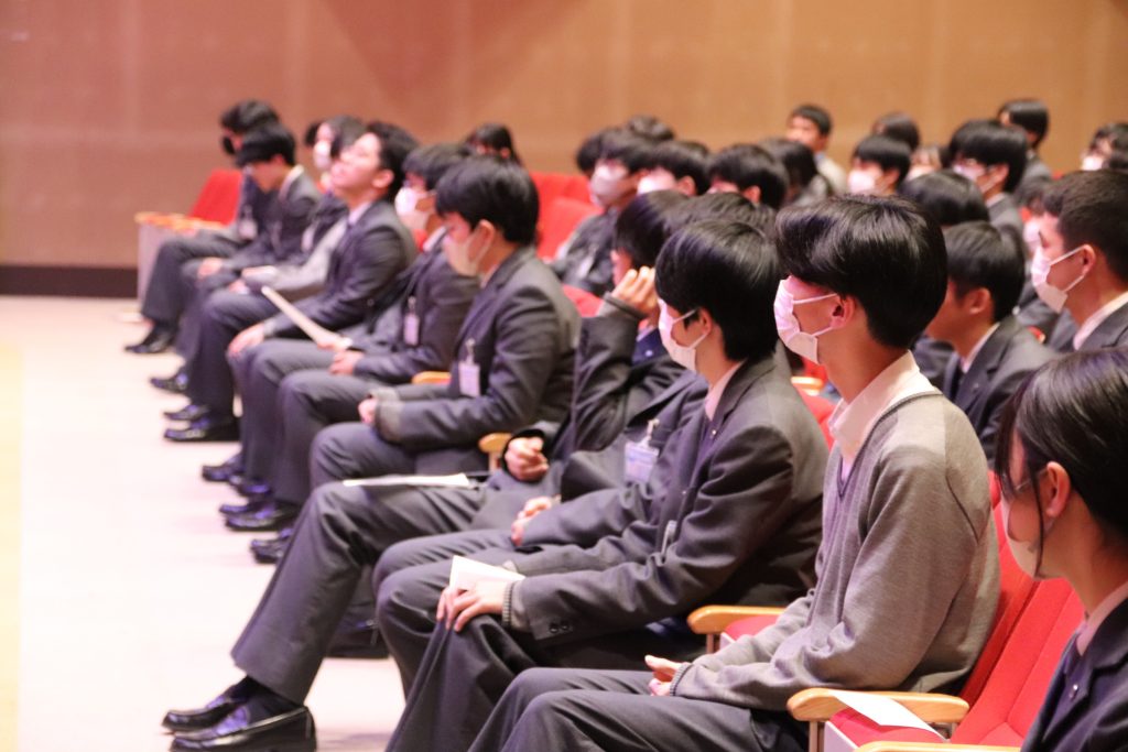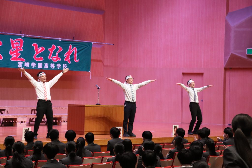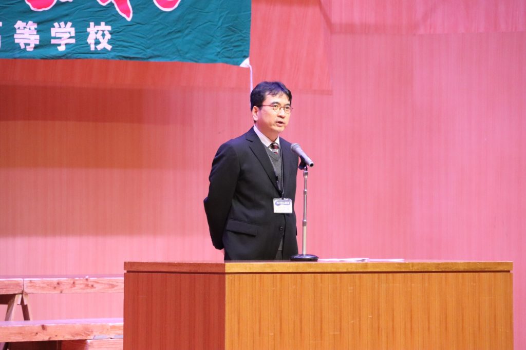校長先生からは英語を用いて受験生への激励の言葉が贈られ、3学年主任の先生、特進科主任の先生からも体験談やアドバイスを交えた実践的で心強い励ましがありました。その後、先生方による寸劇が披露され、緊張感の中にも笑顔が生まれる場面もありました。