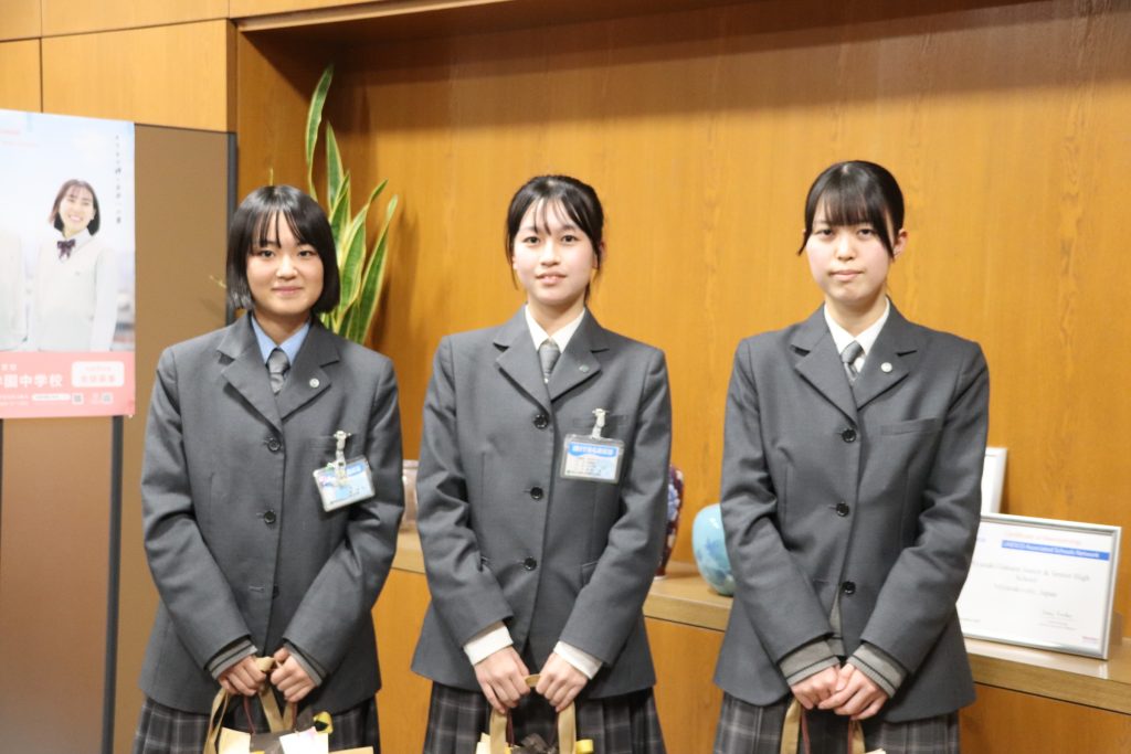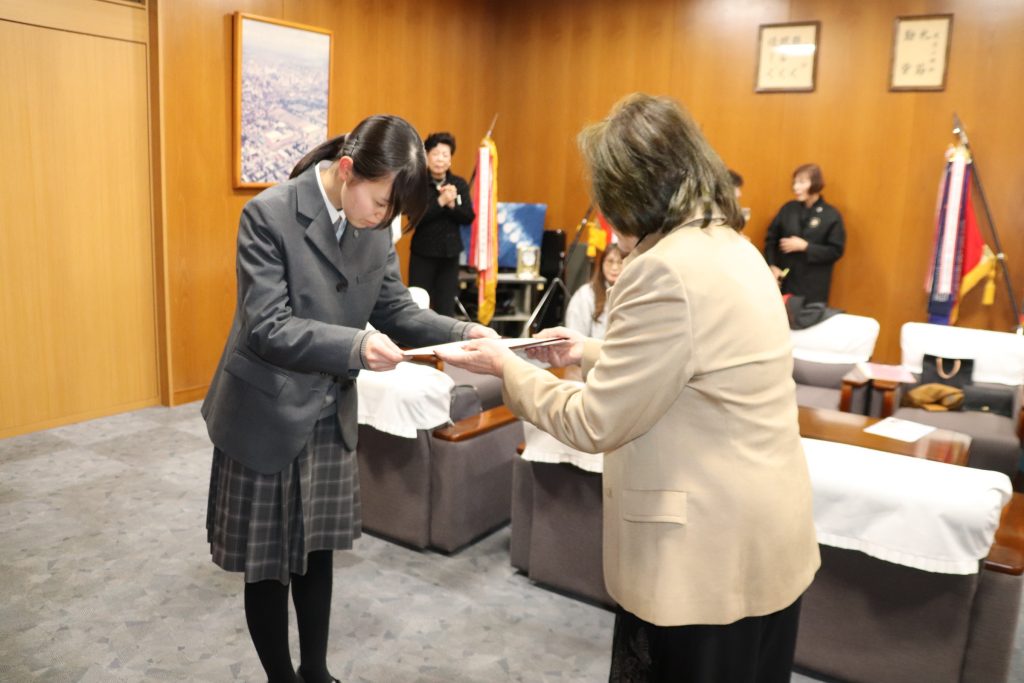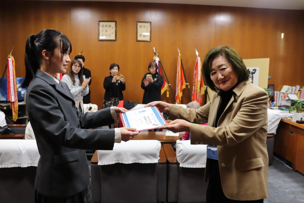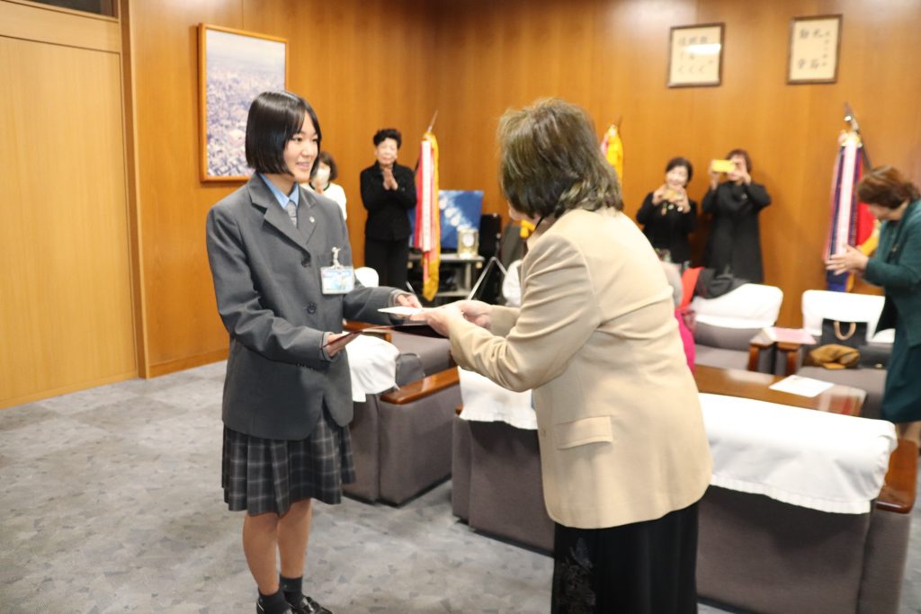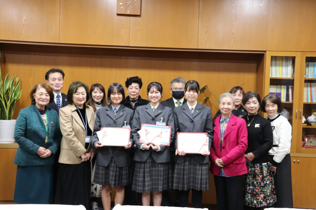 国際ソロプチミストアメリカ日本南リジョンの事業「Take ONE step(進学応援プロジェクト)」において、本校生徒 3年B組 金山 幸さん・3年B組 小薮 菜月さん・3年1組 河野 七夏さんを支援対象としてお選びいただきました。温かいご支援として支援金を贈呈いただき、心より感謝申し上げます。