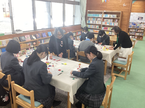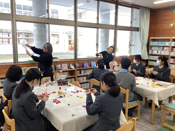 今月は、つまみ細工の講師として活躍されている、本校卒業生をお招きしました。つまみ細工は、小さな布を折り重ねて花などの形を作る日本の伝統工芸です。分かりやすい説明のもと、参加した生徒たちは熱心に作業に取り組みました。それぞれが個性あふれる、素敵な作品を完成させることができました。