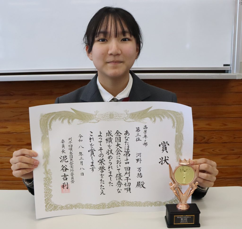 1年S組の河野万結さんが、「第14回 刈干切唄全国大会」において高学年の部 第3位を受賞しました。本大会は、郷土に伝わる民謡「刈干切唄」の魅力を広く伝えることを目的に開催されている全国大会です。河野さんはこれまでも同大会で受賞を重ねており、今回も日頃の練習の成果を発揮し、第3位という素晴らしい成績を収めました。受賞おめでとうございます。